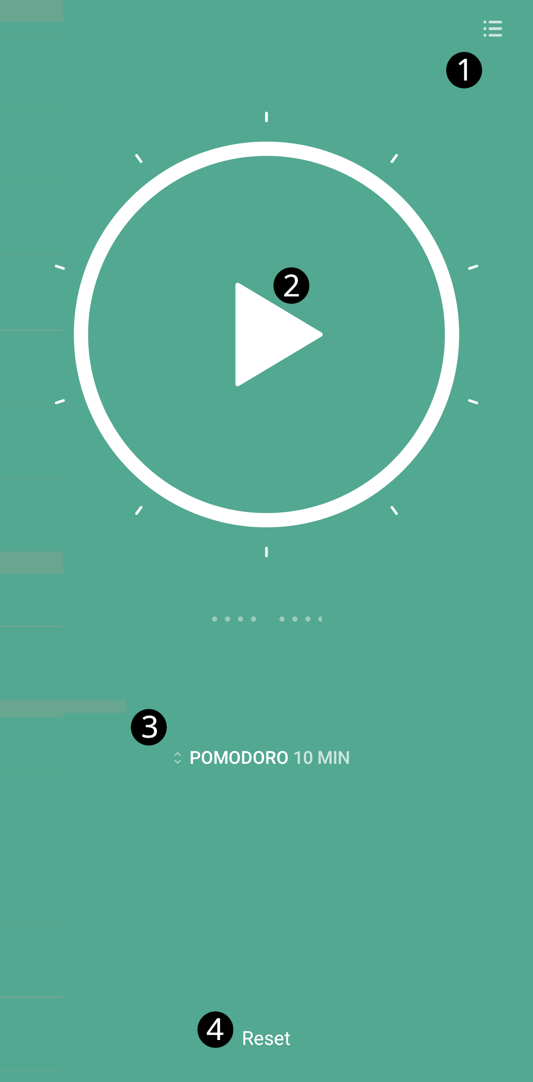 Hamburger button in the top-right corner — Settings. Note that the hamburger button disappears whenever in the middle of a period. To get it back, long-press in the center of the circle.
